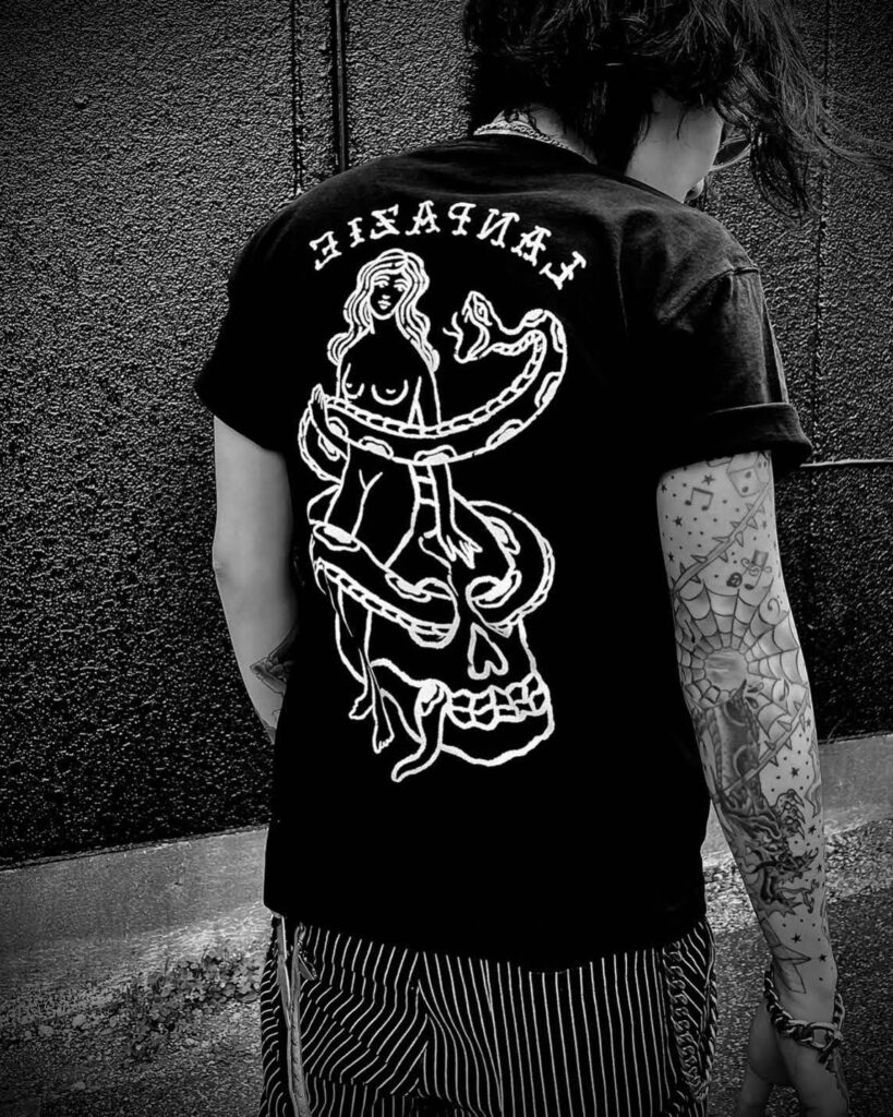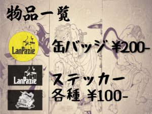 現在LANPAZIEのグッズは全てライブ会場にて販売しています。 ※数に限りがありますのでご了承ください 7.1oz HEAVY COTTION Poket T-shirt 白 ファラオホース 黒 ピンナップガール M L XL 各¥4,000(税込み) Design by MASATO Tシャツ 旧作ラインナップ LOGO Tシャツ ¥2,500- 亀と兎 Tシャツ ¥2,000- 2nd ALBUM JACKET Tシャツ ¥2,000- シルバー、その他 LANPAZIE × 黒薔薇座 コラボピンブローチ 各¥3,000- LIVE会場限定販売(数量限定) LANPAZIE × 黒薔薇座 コラボキーホルダー ¥10,000- LIVE会場限定販売(数量限定) 缶バッジ ¥200- ステッカー 各種¥100- Facebook postLINE